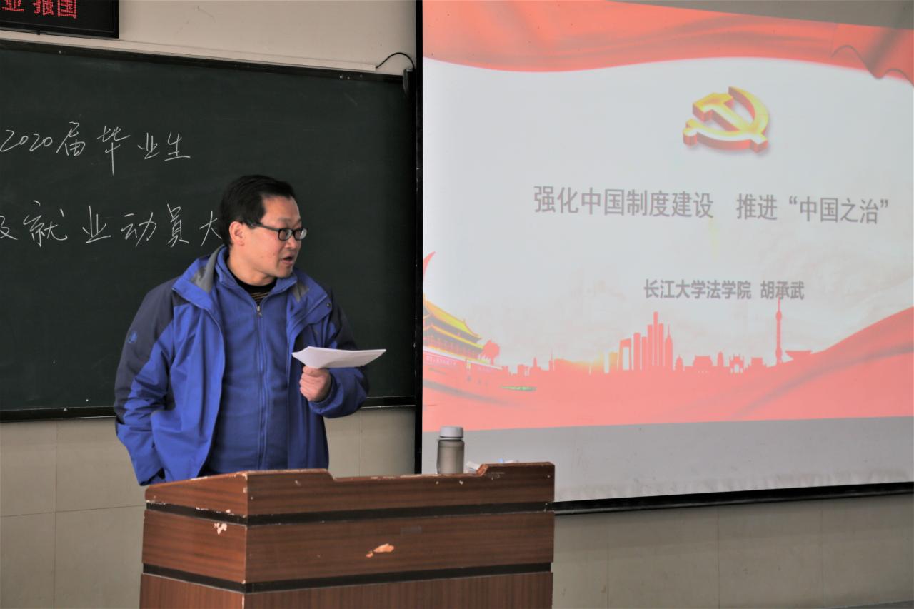 (通讯员:徐文健)12月26日下午4时许,永利官网副教授胡承武为16级学子宣讲了党的十九届四中全会精神。