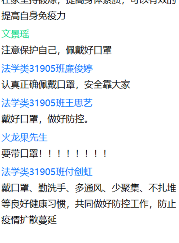 本次主题班会主要带领同学们学习了《公众科学戴口罩指引(修订版)》、《夏季空调运行管理与使用指引(修订版)》以及《高等学校新型冠状病毒肺炎防控指南》等文件,让同学们了解到“如何科学的戴口罩”、“夏季空调的使用与管理”以及“高校该如何防控疫情”的相关知识,并组织大家各自填写了一份关于“77779193永利官网全体学生对疫情防控学习情况的调查”的问卷,以帮助同学们加深对文件的认识。同时,同学们也在班会上分享了自己对疫情防控措施的理解。