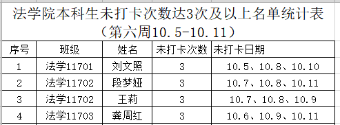 根据学校要求,2020年10月5日-10月11日组织全体本科生、进行每日辅导猫打卡。经分管辅导员、学工助理、班干部多次提醒,仍有4名同学未在规定时间内完成打卡,具体未打卡次数及日期如下:(表格显示)