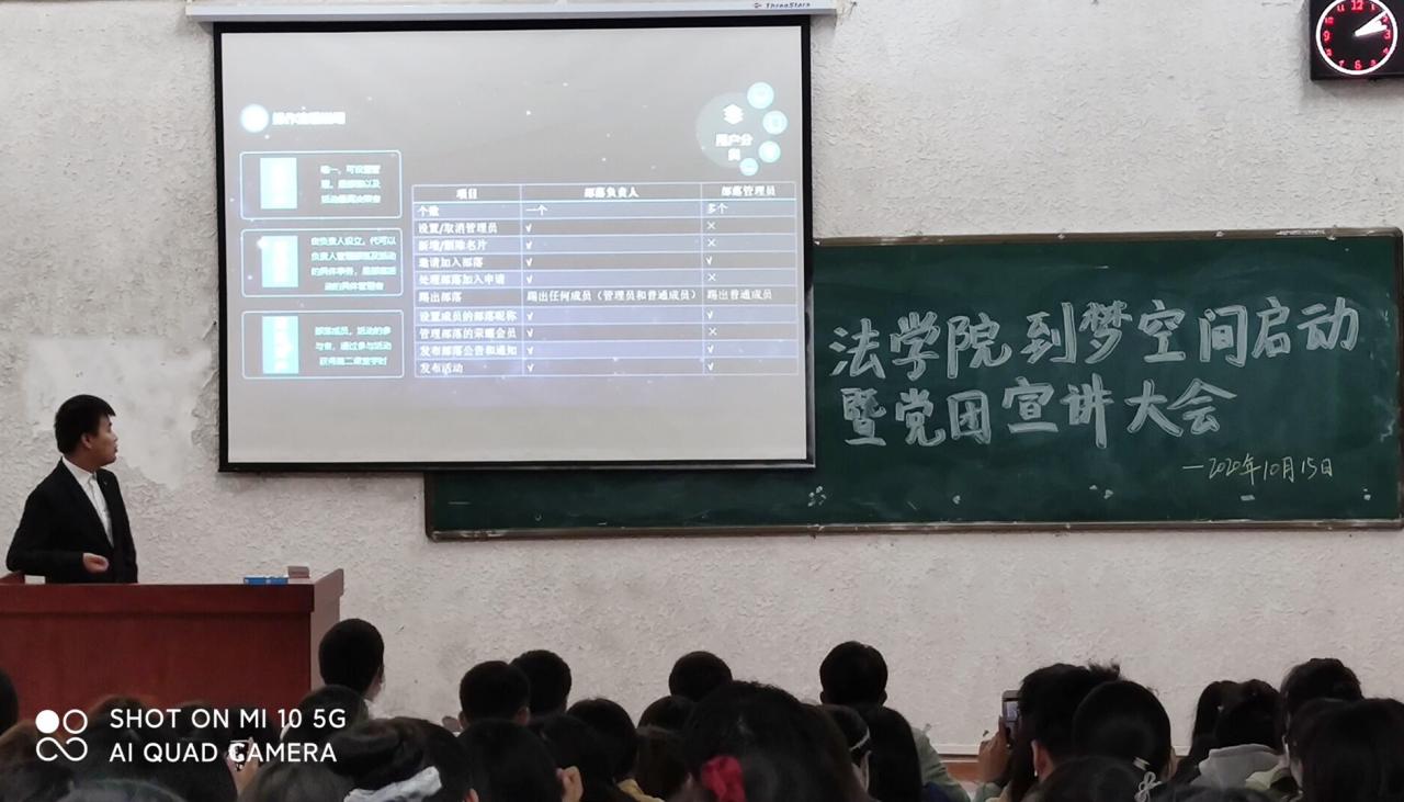 大会伊始,主持人对2020级77779193永利官网全体同学的到来表示欢迎,并宣布大会开始。学科部胡力布详细介绍了“到梦空间”活动背景、性质,“高校共青团”、“第二课堂成绩单”制度及APP操作流程。胡力布学长还讲解了在APP使用过程中可能会遇到的常见问题及对应方案。会议第二项内容,由团委学生会组织部同学宣讲党团相关知识。首先,由田博文学长对组织部成员、分工等进行了介绍,然后,他重点讲解了青年大学习、主题团日活动(即班团会)、团员教育评议工作。随后,沈雨盈学姐对推优入党流程进行了宣讲。最后,同学们针对党团方面工作提出了一些疑惑,由组织部同学一一作出解答。