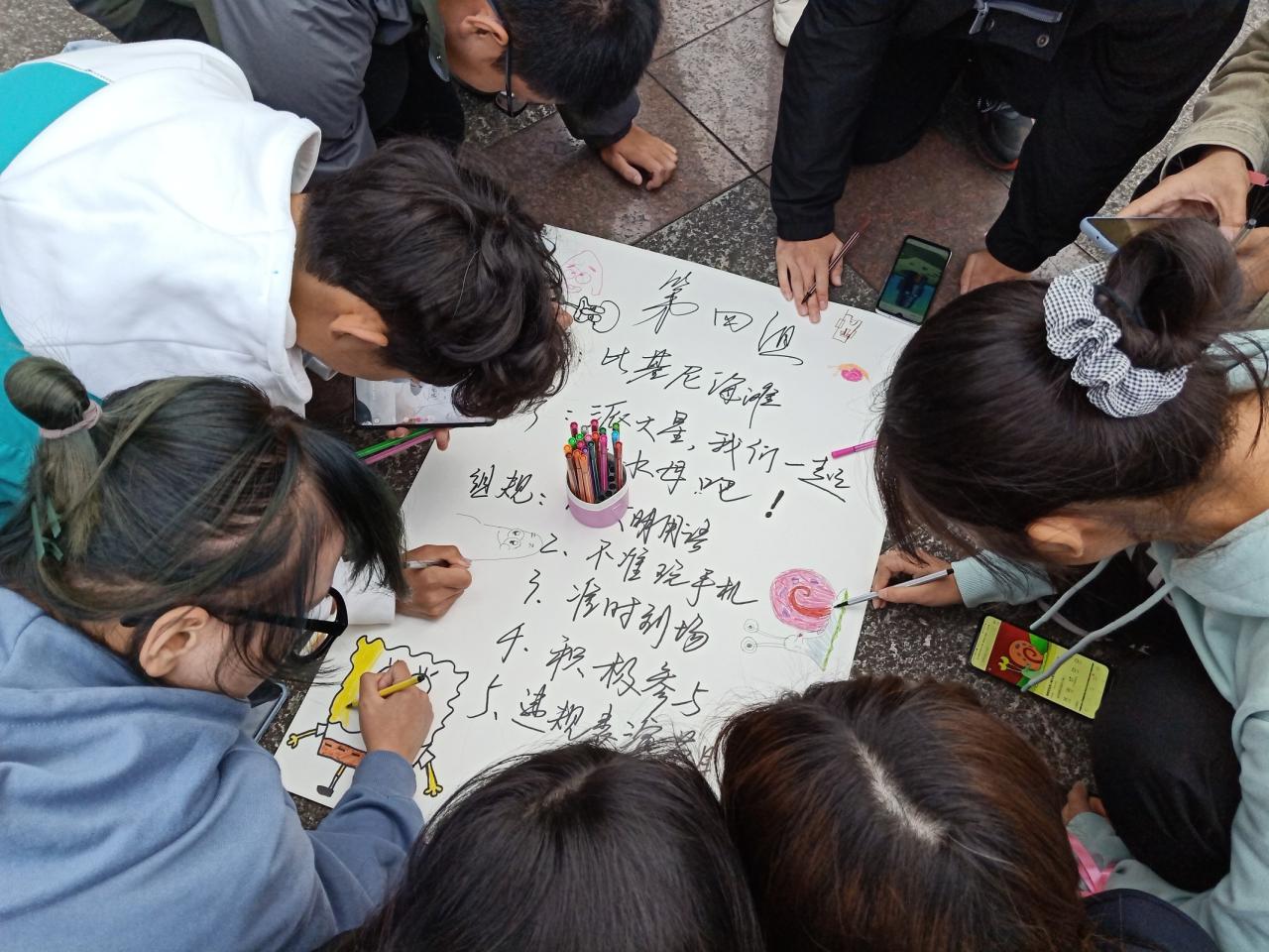活动伊始,由四叶草社会工作协会会长任豆豆做活动推介。接着,大一新生通过抽取彩带的方式进行随机分组。本次活动主要分为三个环节,第一个环节是中,组员依次进行自我介绍,再通过小游戏的方式加深成员之间的熟悉度。第二个环节是建立小组,组长带领组员创建组名、口号、组规和对小组的期望,并将其记录在海报上。一些小组的组名更是别具一格,如:闪光少年、长大十三香、一言不合就开队、社会主义接班队……第三个环节是小组风采展示,各小组依次展示小组特色及成果,响亮的口号回荡在五教广场。最后,各小组对本次活动进行简单总结,新生适应工作坊第一期活动在合影留念后落下帷幕。