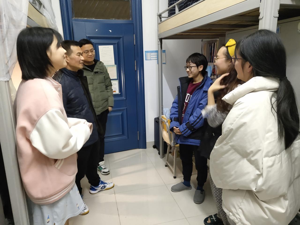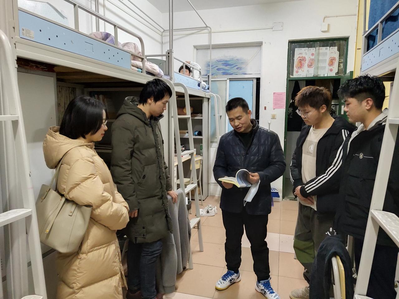 1月2日晚,永利官网领导周胜美书记及辅导员周晓峰、盛文军到寝室看望2021年寒假留校学生。