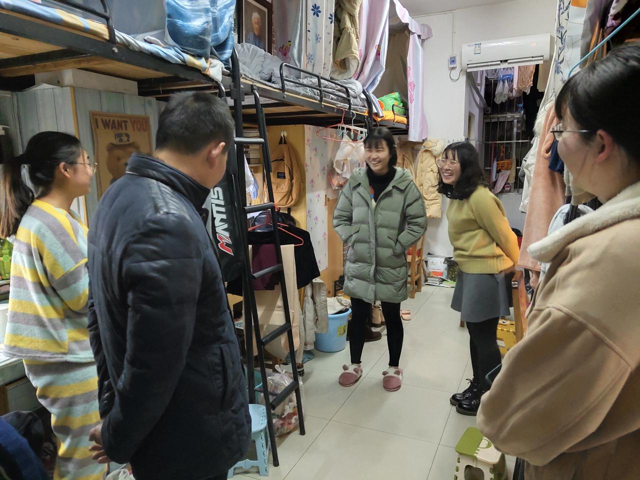 在2017级社工专业女生寝室,周书记强调注意用电安全,注意除湿防霉和防寒保暖,希望社工学生能够刚强、勇敢,用自己的社工情怀去帮助需要帮助的人。