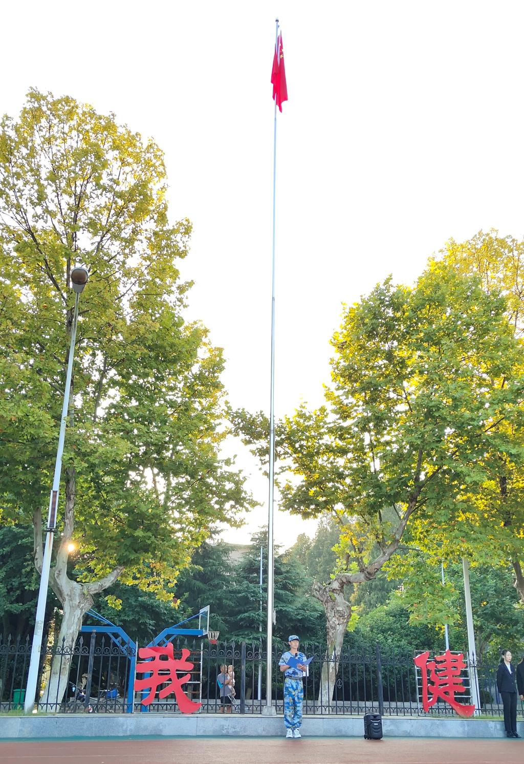 在升旗仪式上,五星红旗缓缓升起,全体师生在庄严的氛围中向国旗行注目礼,并齐唱国歌。