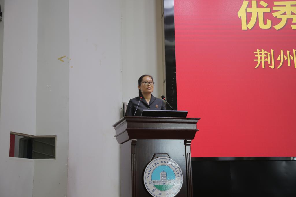 接下来,校友代表罗曼、老生代表王伟、研究生新生代表魏林、本科新生代表陈锐及教师代表杜厚扬分别进行发言。其中杜厚扬老师讲述了自己对大学学习的理解以及对同学们的期许,表达了自己与同学们在2021年金秋聚首荆州的喜悦之情,她希望每位同学都能在大学中快乐学习,积极向上,尊重并热爱自己的选择,对自己的选择负责。