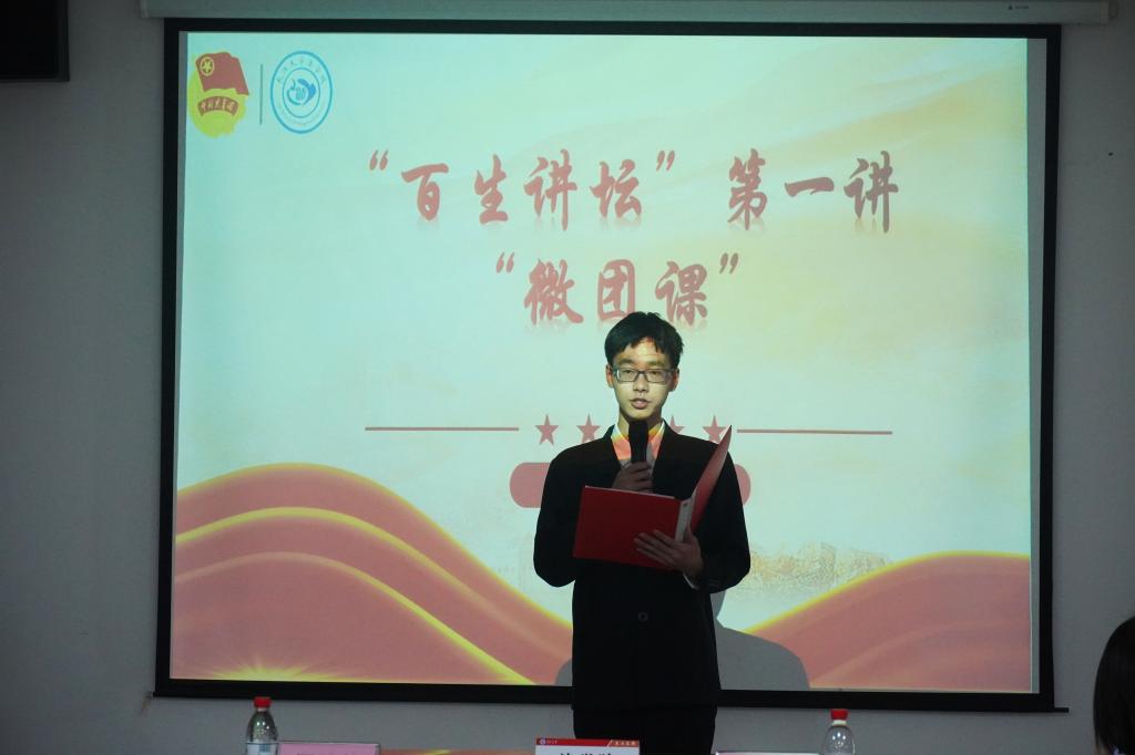 在本次活动中,13名参赛选手依次上台讲授主题“微团课”,包括党史学习教育、党团理论知识、青年工作实践等,积极营造“百团讲,百生评”的良好氛围。胡智豪同学的微团课——《不忘来时路,奋斗新征程》,从永葆初心、矢志创新、自我革新三方面讲解了他对百年党史的认识。田晋宇同学的《奏响主旋律,点亮青春梦》,通过讲述黄大年同志的故事,阐述社会主义核心价值观的重要性,并呼吁当代青年将社会主义核心价值观落到实践中去。最后,周老师对同学们的表现一一点评,鼓励同学们积极主动学习百年党史,讲好中国故事。