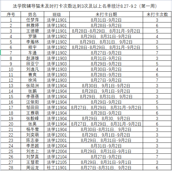 根据学校要求,2022年8月27日——9月2日(第一周)组织全体本科生进行每日“辅导猫”打卡。经分管辅导员、学工助理、班干部多次提醒,仍有28名同学未在规定时间内完成打卡,具体未打卡次数及日期如下:(表格显示)