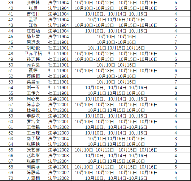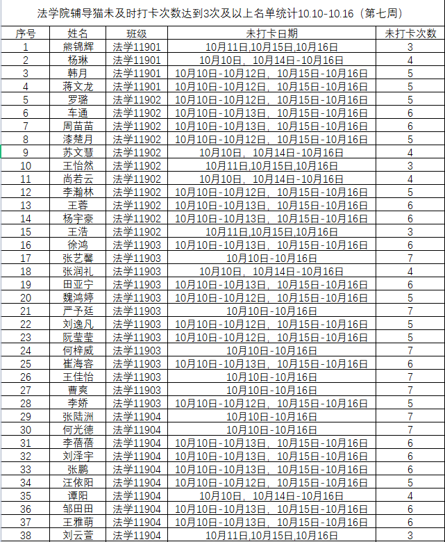 根据学校要求,2022年10月10日——10月16日(第七周)组织全体本科生进行每日“辅导猫”打卡。经分管辅导员、学工助理、班干部多次提醒,仍有70名同学未在规定时间内完成打卡,具体未打卡次数及日期如下:(表格显示)
