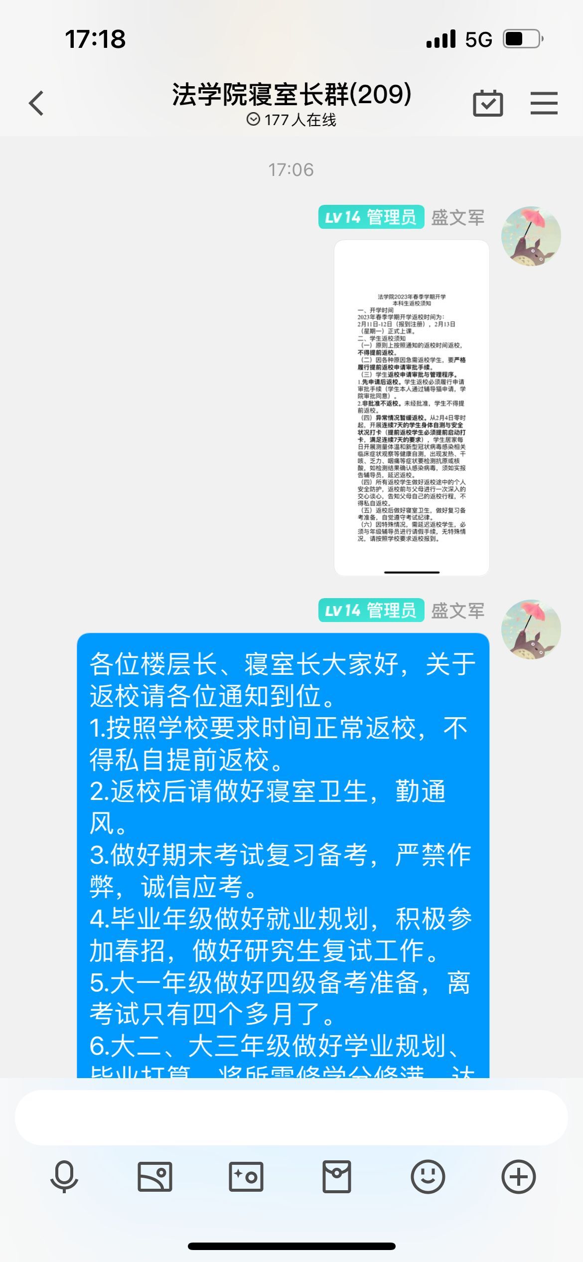 2月4日下午17时,永利官网组织楼层长、寝室长在学院寝室长群内召开了2023年春季学期返校安全工作会议,会议由辅导员盛文军主持。