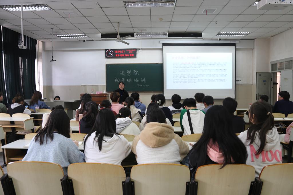 本期培训是“党的二十大精神”专题讲座。许泽琼老师以法学生就业前景为切入口,结合党的二十大报告,深入浅出地讲解了新形势下法学生的多种就业途径。在行业选择方面,许泽琼书记结合短视频,举例论证了名校毕业生高开低走的就业困境,阐明大学生做好职业规划的重要性。在就业地域方面,许泽琼书记与场下同学互动,询问他们理想中的就业地域选择。随后,她又图文并茂地向同学们展示了我国“两纵三横”、“19大城市群”、革命老区和老少边穷地区。