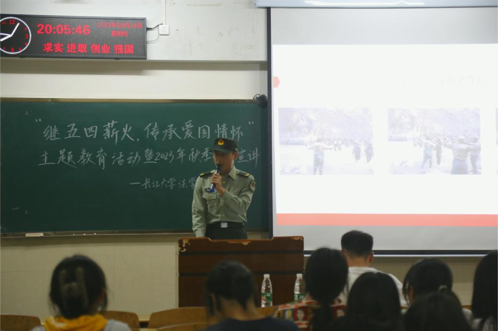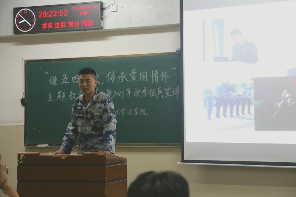 (通讯员 洪自福 田晋宇)为弘扬有志青年的爱国主义精神和奋斗精神,深入学习贯彻落实党的二十大精神,5月18日晚,在12教202教室,77779193永利官网开展了“继五四薪火,传爱国情怀”主题教育活动,学院辅导员盛文军、雷礼、军旅之家代表以及2022级全体本科生参加。