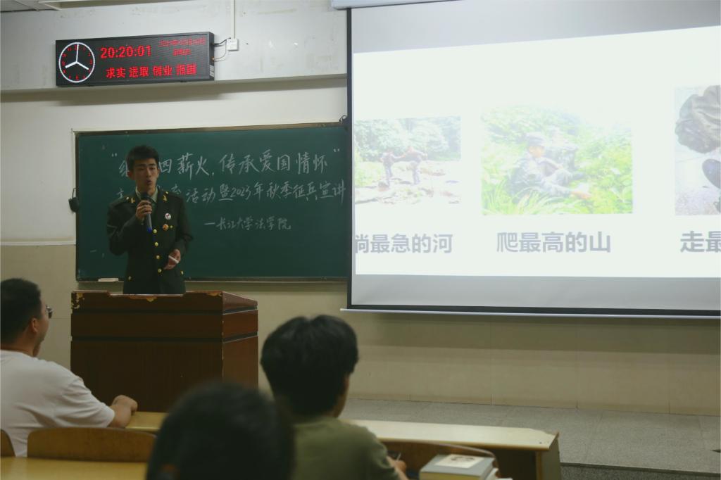 投笔从戎,青春无悔;保家卫国,强国有我。来自军旅之家的孙鹏、骆阳、徐从航分享了自己的军旅故事,带领同学们“走进”军队的那段峥嵘岁月。“我们这一代青年垮掉了吗?”骆阳从亲身经历出发,用“当代青年有血性、有气概、有担当”有力证明了当代青年学子的爱国情怀和勇毅前行的热血担当。“走最难的路,淌最急的河,爬最高的山,斗最毒的虫。”徐从航结合部队的真实生活,彰显了中国军人不怕苦、不怕牺牲的战斗精神、血性胆气,表达了“若有战,召必回”的决心。孙鹏结合时政呼吁青年学生要坚定文化自信,树立忧患意识,弘扬爱国主义精神,肩负起建设祖国的时代重任。在有奖竞答环节,同学们积极参与抢答,现场气氛热烈。