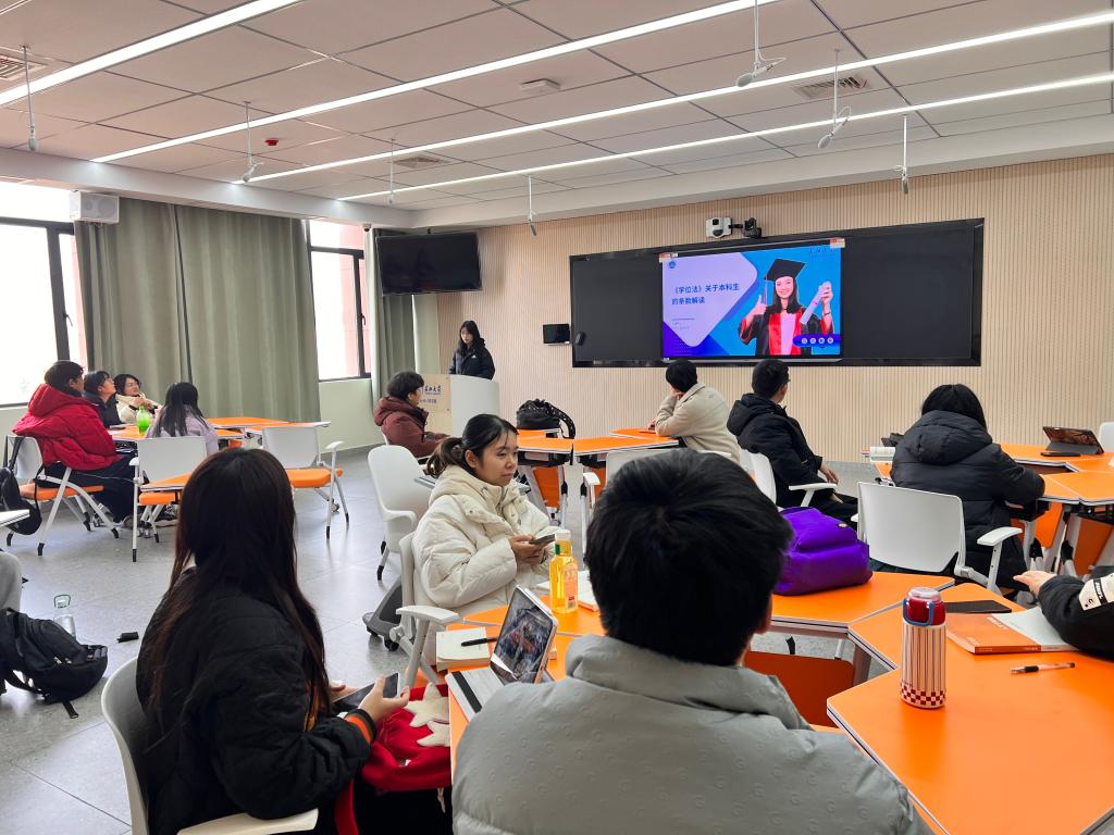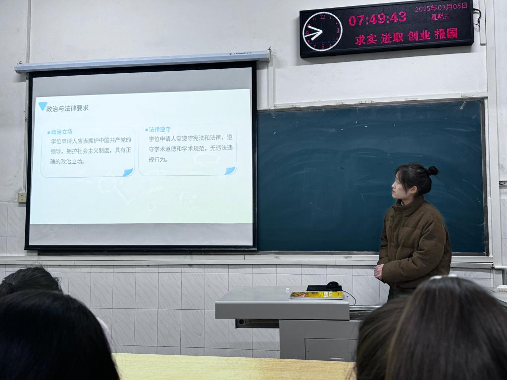 班会伊始,各班学习委员系统地介绍了《学位法》的立法背景及其实施的重大意义。《学位法》于2024年4月26日由十四届全国人大常委会审议通过,并于2025年1月1日正式施行。这部法律是我国高等教育法治化进程中的一个重要里程碑,旨在规范学位授予程序、保障学位质量、维护学生合法权益。通过与原《中华人民共和国学位条例》的对比,同学们更深刻地理解了新法在细化授予条件、强化质量监管、完善争议处理机制等方面的创新之处。