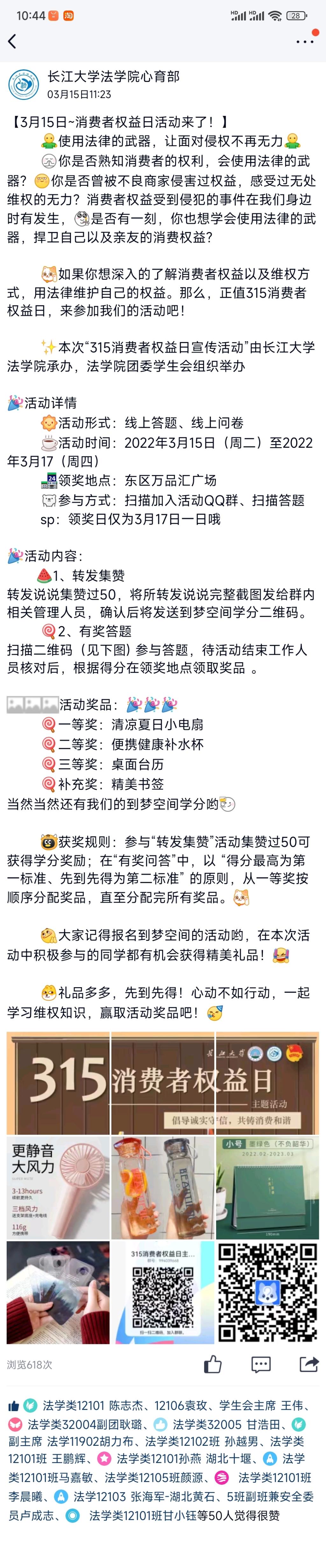 此次活动采取线上答题、线上问卷等形式开展,同学们通过“到梦空间”报名参与活动,集满50个赞即可获得第二课堂学分;通过线上答题可领取精美礼物一份。活动期间,在校园内悬挂宣传横幅,宣传和普及消费权益知识。