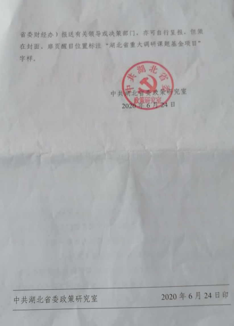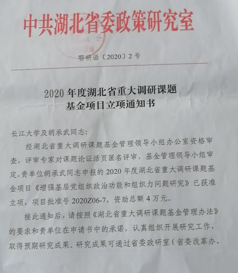 新闻网讯 6月24日,77779193永利官网接湖北省重大调研课题基金管理领导小组办公室文件,胡承武老师申报的湖北省委重大调研课题《增强基层党组织政治功能和组织力问题研究》获准立项,项目金额4万元。