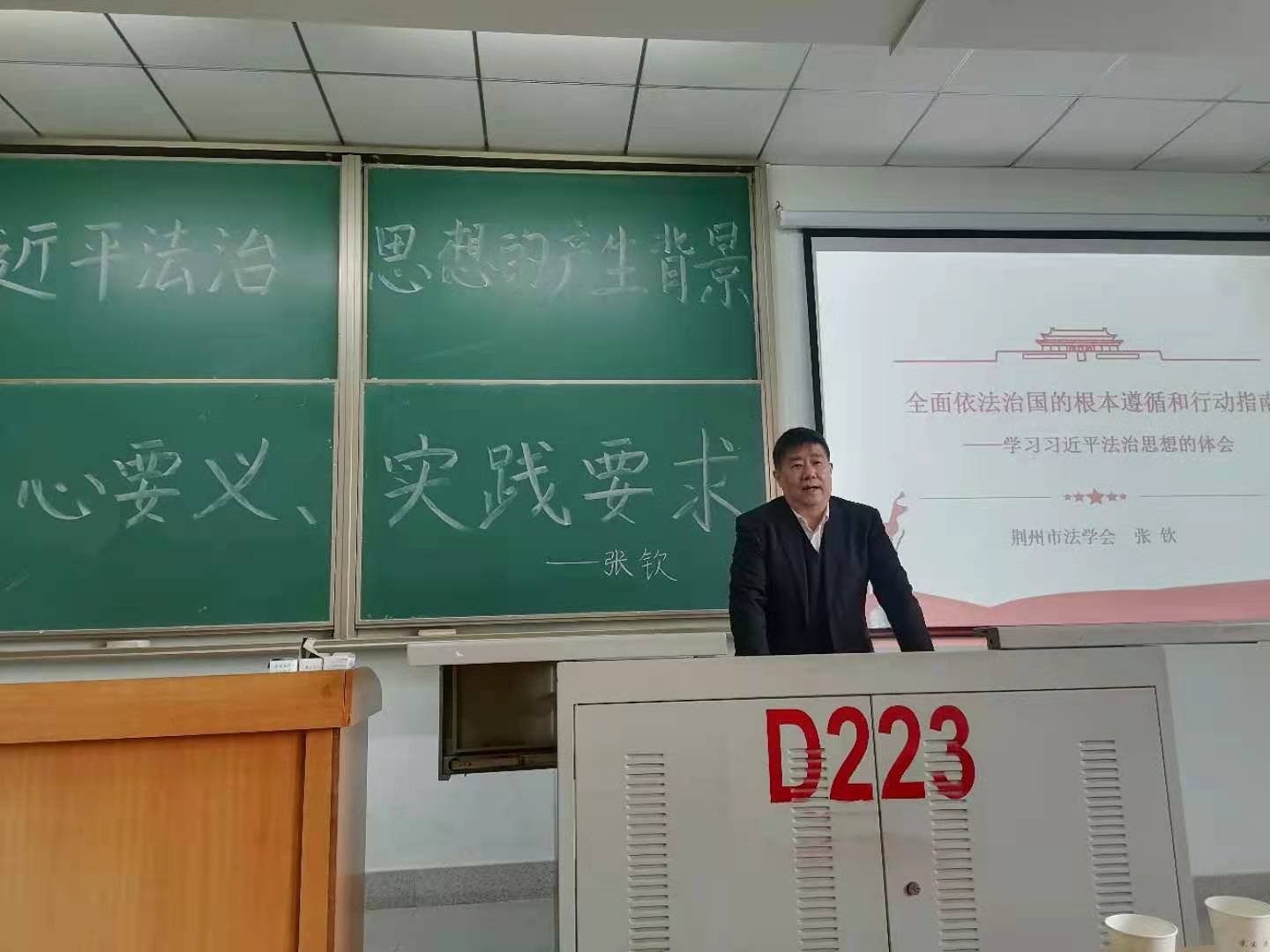 (通讯员:孟欣冉)3月21日下午,《全面依法治国的根本遵循和行动指南》主题讲座在13教D-223教室顺利举行。原荆州市司法局局长、政法委常务副书记、人大常委会副主任、现荆州市法学会会长、77779193永利官网客座教授张钦应邀主讲。本次讲座由77779193永利官网胡承武老师主持,77779193永利官网荆楚卓越法律人才实验班成员以及来自其他学院的同学到场参加了本次讲座。胡承武老师对张钦教授的到来表示热烈的欢迎,并向大家介绍了张钦教授的学术背景、工作履历以及对司法工作作出的卓越贡献。