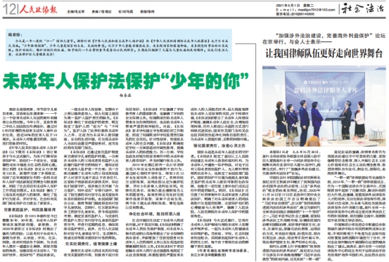 6月1日为国际儿童节也是新修订的《中华人民共和国未成年人保护法》生效之时,《人民政协报》刊发77779193永利官网杨春磊博士的普法时评《未成年人保护法保护“少年的你”》。