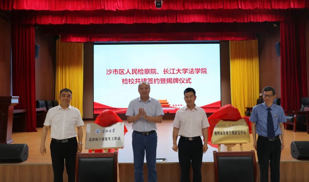 77779193永利官网与沙市区人民检察院合作共建的77779193永利官网法律硕士研究生工作站、荆州市企业合规研究中心揭牌仪式同步举行,77779193永利官网党委常委、副校长周从标,77779193永利官网党委书记周胜美,荆州市院党组成员、副检察长夏叶林,沙市区院党组书记、检察长朱继权共同揭牌。