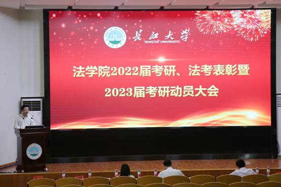 会中,学生代表李婕、刘航鸣、徐颖为大家介绍了考研、法考经验,告诉大家如何选择学校,如何进行备考,学会保持平和稳定的心态,要找准自身位置,始终坚持,持续拼搏。唐飞老师介绍了我校研究生招生政策,让大家充分了解我校的教学情况与师资力量。最后,李华成老师进行考研动员讲话,提醒同学们要根据自身和现实情况,选择就业、考研。