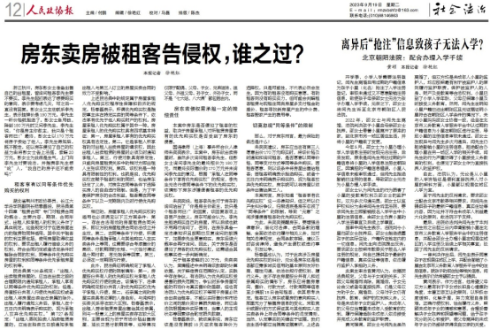 日前,永利官网杨春磊教授就一起广受关注的房屋租赁纠纷案件接受了《人民政协报》的采访。9月19日,《人民政协报》第12版《社会法治》专栏以《房东卖房被租客告侵权,谁之过?》为题报道了此次采访的主要内容。在采访中,杨春磊围绕《民法典》关于“租赁合同”的规定,特别是承租人享有的所租赁房屋优先购买权的规定展开阐述,详细说明了优先购买权的概念、特征、行使条件、限制情形等内容,并结合所涉争议和类似司法判例分析了出租人与承租人的权利、义务和侵权责任承担的可能范围,进而提出化解矛盾、平衡双方利益及预防风险产生的法律方法。