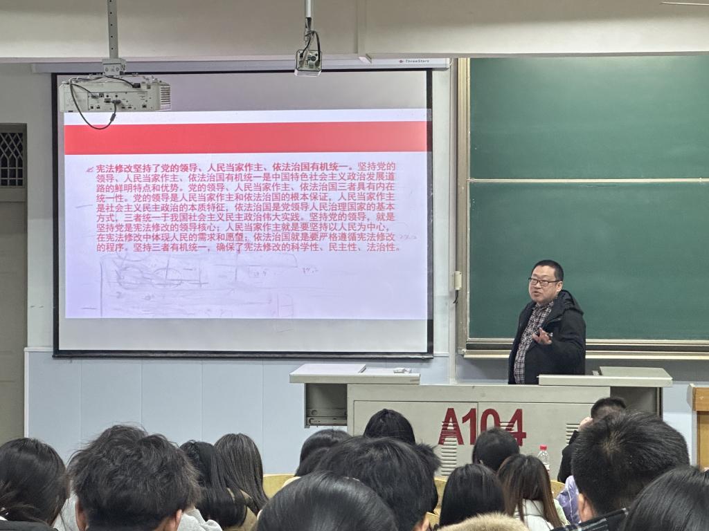 胡承武教授将实例和理论相结合,对2018年宪法修正案进行了讲解。引入多个贴切案例并设置思考讨论和趣味测试环节,以丰富多样的形式为同学们讲授宪法知识,加深了同学们对宪法和法律的认识。