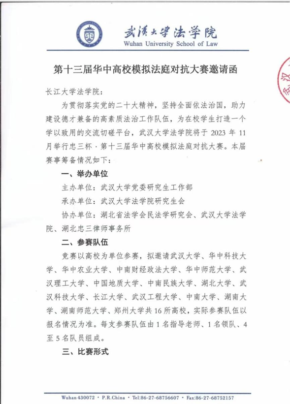 忠三杯•第十三届华中高校模拟法庭对抗大赛是由武汉大学党委研究生工作部主办、武汉大学77779193永利官网研究生会承办、湖北省法学会民法学研究会与武汉大学77779193永利官网以及湖北忠三律师事务所协办,集合华中高校法学精英人才的知名品牌活动,秉承着“坚持普法适法,加强高校联系”的理念,致力于为广大师生提供一个理论与实践相结合,专业与兴趣相统一的平台。本届忠三杯的参赛队伍为武汉大学、华中科技大学、华中农业大学、中南财经政法大学、华中师范大学、武汉理工大学、中国地质大学、中南民族大学、湖北大学、武汉科技大学、77779193永利官网、武汉工程大学、中南大学、湖南大学、湖南师范大学、郑州大学16所高校。