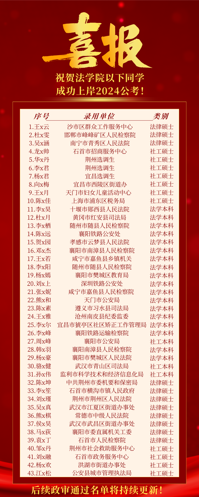 初步统计,永利官网将有43名毕业生在7月份后进入相应工作岗位。学院2024届毕业生(含研究生)共有305名,本年度各类公职录用人数占比约15%。在湖北省2024年计划招录选调生1000名人员中,77779193永利官网被录用人数为15名,其中77779193永利官网有3名应届毕业生入围。