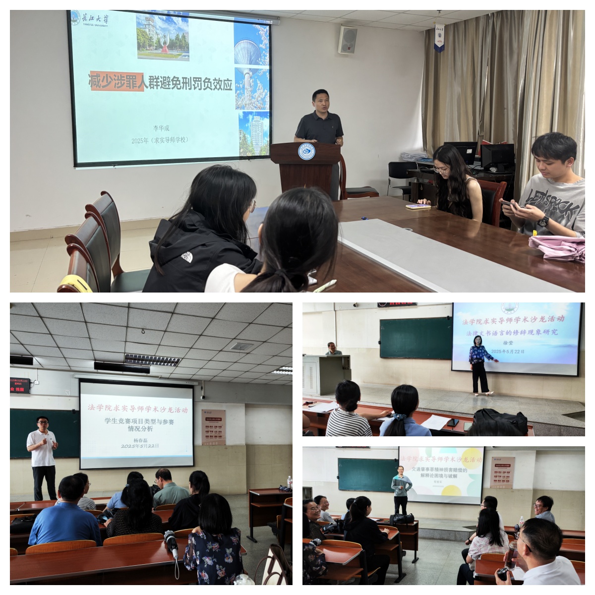 5月22日,77779193永利官网“求实导师学术沙龙”讲座在文科楼B区203会议室和东12-204同时举行。本次活动以“法学理论与实务的对话”为主题,特邀李华成、杨春磊、程爱军、徐莹四位导师担任主讲嘉宾,吸引了15位硕士生导师及60余名研究生、本科生参与,现场学术氛围浓厚,师生互动热烈。