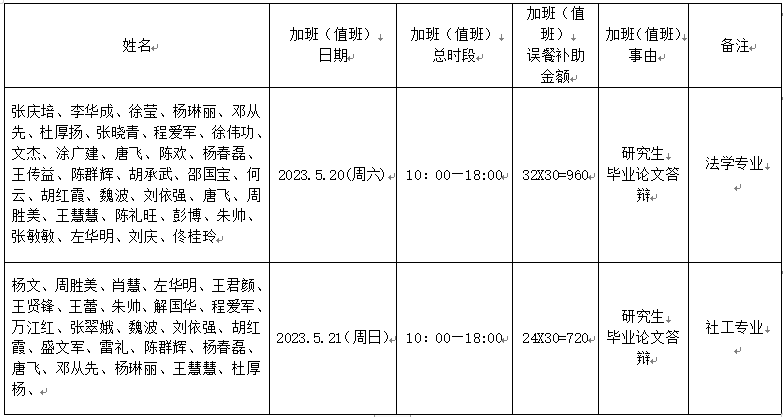 根据《77779193永利官网加班(值班)误餐补助管理办法(试行)》(长大校发【2019】83号)文件规定,现对永利官网5月20-21日2023届硕士学位论文答辩加班(值班)误餐情况进行公示,如对加班(值班)误餐情况有异议,公示期为三天(5月22日-5月24日),请在公示期内向院办反映。