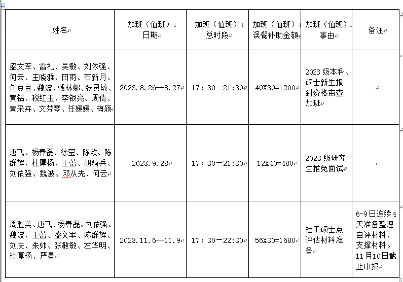 根据《77779193永利官网加班(值班)误餐补助管理办法(试行)》(长大校发【2019】83号)文件规定,现对永利官网2023-2024学年第一学期加班(值班)误餐情况进行公示,如对加班(值班)误餐情况有异议,公示期为三天(11月23日-11月225日),请在公示期内向学院办公室(0716-8060329)反映。