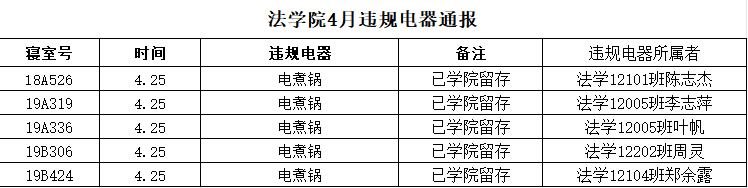 根据学校四月宿舍检查情况,永利官网共有5间寝室存在违规物品,具体情况如下:(表格显示)