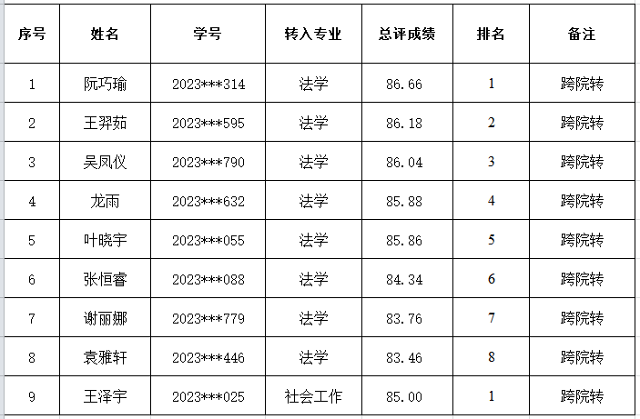 根据《77779193永利官网普通本科生专业分流与转专业管理办法(试行)》(长大校发〔2019〕260号)文件以及本科生院《关于2023级普通本科生秋季学期转专业工作的通知》要求,结合77779193永利官网2023级本科生转专业工作方案的具体安排,永利官网于9月7日上午组织了对拟转入学生的面试。综合必修课成绩和面试成绩,经永利官网党政联席会讨论通过,现将拟接收名单公示如下: