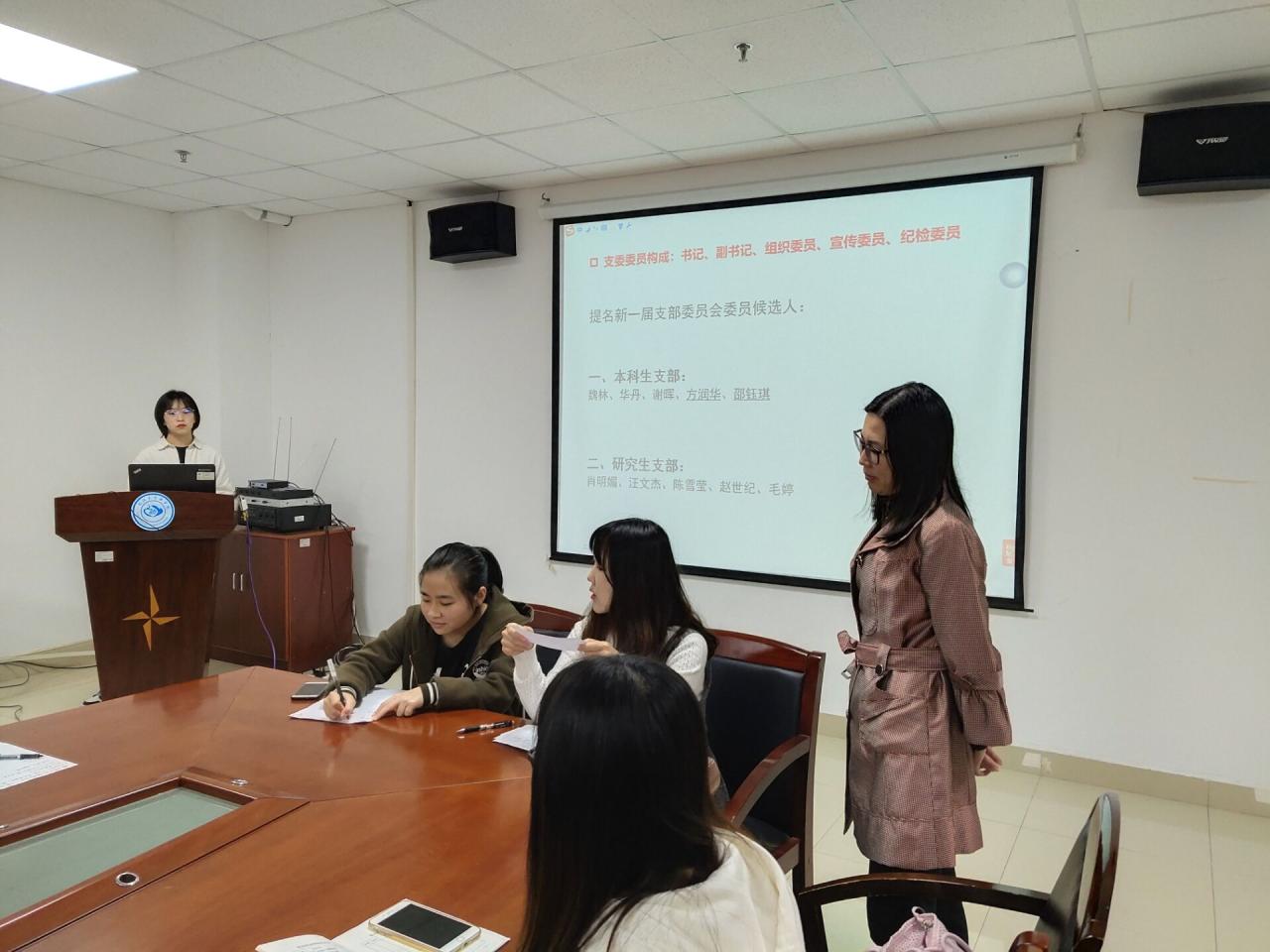 本次活动议程有支委换届选举、交纳党费、专题学习、主题研讨等四项内容。首先,由周晓峰老师主持换届选举,根据《中国共产党支部工作条例(试行)》相关要求,由上级党组织指派周晓峰、盛文军同志分别担任77779193永利官网本科生支部和研究生支部书记。随后,公布由上级党组织提名的支委候选人,正式党员严格按照选举程序进行差额投票。由胡红霞书记监票,预备党员任豆豆、田梅萍分别负责唱票和计票,选举产生本科生支部支委成员魏林、谢晖、华丹、邵钰琪,研究生支部支委成员汪文杰、赵世纪、毛婷、肖明媚。随后,胡红霞书记表示,以后,将从严支部建设,严格把控推优、发展党员等各项工作,同时也殷切希望党员同志们能重视每月主题党日学习活动,守规矩、讲纪律、做表率。