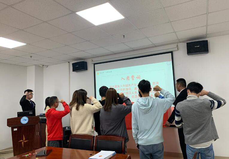 在仪式正式开始之前,主持人田博文首先对参与此次活动的老师及同学表示了感谢。仪式第一项,全体起立,奏唱国歌。接着主持人宣布了本次新入团团员的名单,由周老师为其颁发团徽和团员证,授予团员标志的象征。在田博文同学的带领下,一众人面向团旗,握拳宣誓,昭示着加入中国共青团的决心与抱负。随后,组织部王传兴同学为大家宣读部分团章内容,明确了身为团员应有的义务,勉励同学们认真学习、牢记使命。